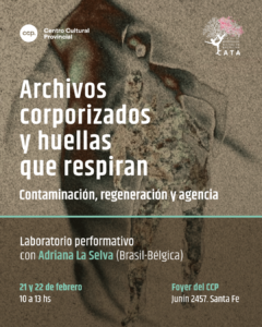 El próximo sábado 21 y domingo 22 de febrero, de 10 a 13 hs, tendrá lugar el laboratorio performativo de dos días facilitado por Adriana La Selva «Archivos encarnados y huellas que respiran. Contaminación, regeneración y agencia» en la Sala Foyer del Centro Cultural Provincial. El formulario de inscripción ya está disponible y los cupos son limitados.